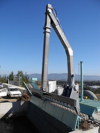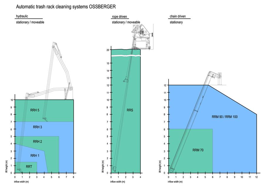 Ossberger developed the stationary, hydraulic trash rack cleaner of type RRH for the automatic cleaning of small and medium-sized trash racks installed at water intakes of channels and storage basins. This machine is equipped with single-arm, wide extending angle booms, on which the cleaning rake is attached perpendicular to the river flow. The boom consists of two arms jointed by a pivoting bearing. Hydraulic cylinders move the rake up and down according to the geometry of the screen. Additionally, the traction arm can be furnished with a telescopic extension; a hydraulic aggregate controls the oil supply.